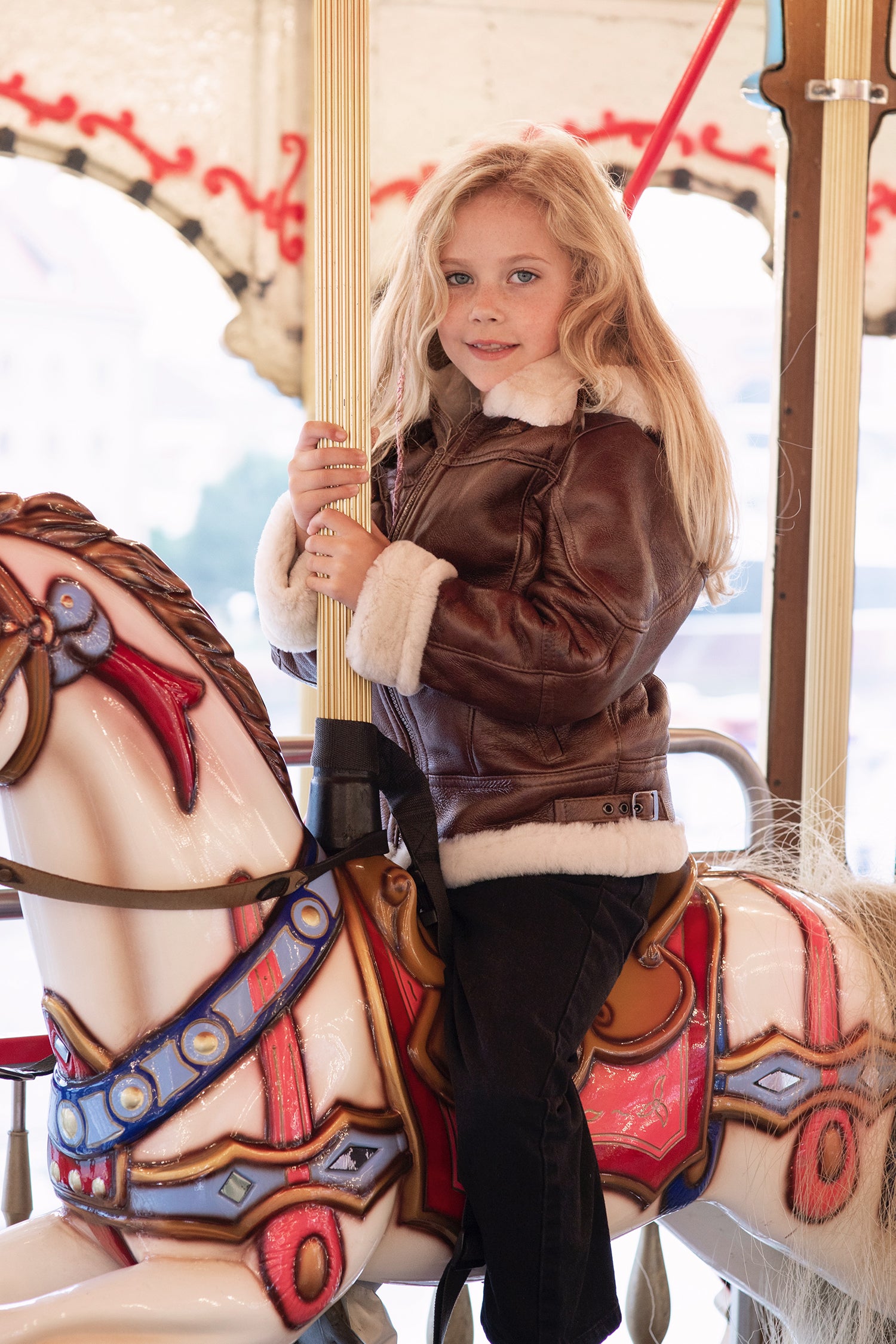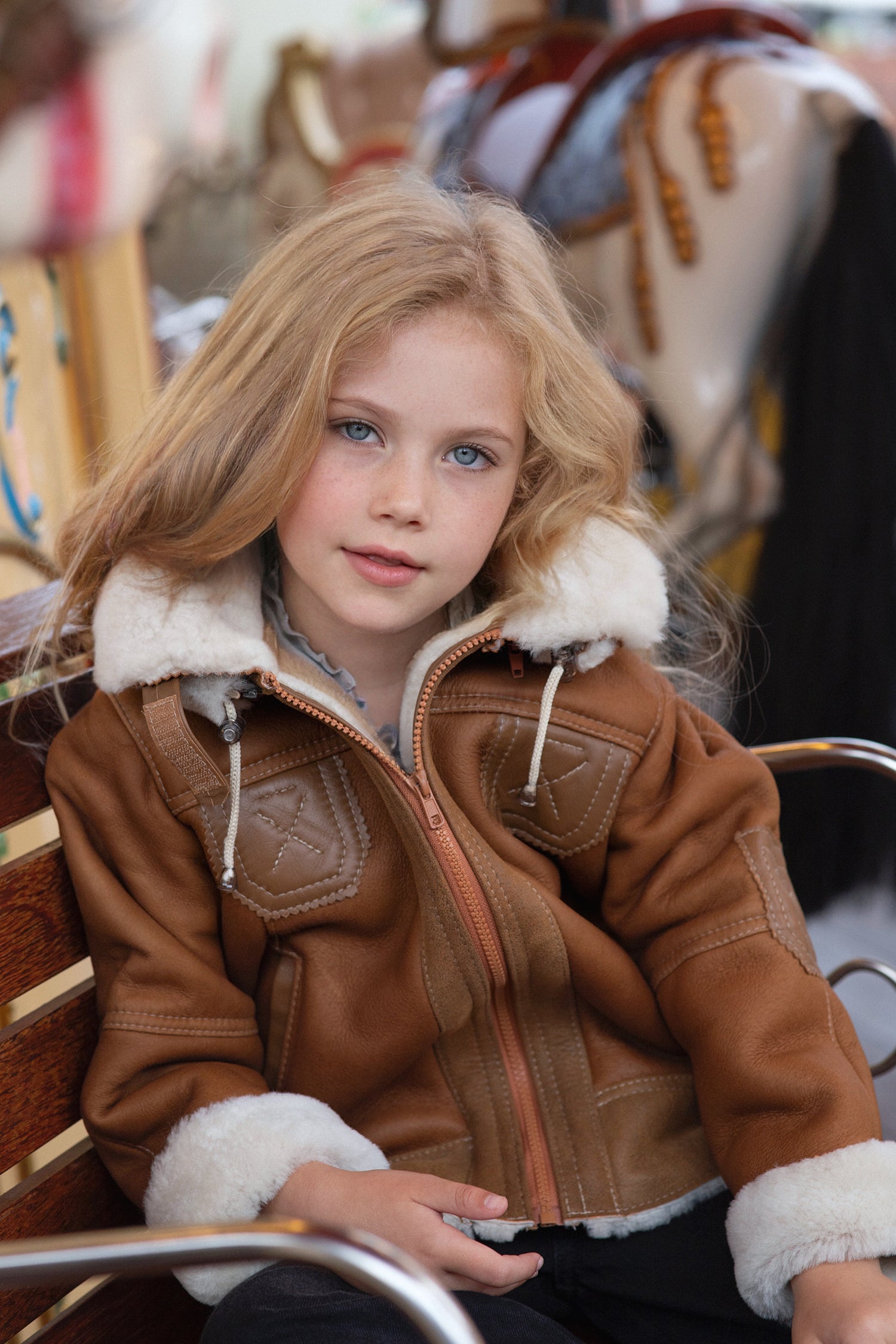 Keep your little one warm and stylish with this classic brown aviator sheepskin jacket. Crafted from genuine sheepskin, it features a soft, full sheepskin lining for ultimate comfort and insulation against the cold.